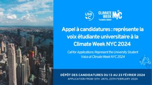 Le Réseau UniC est fier de dévoiler cette nouvelle expérience concrète de leadership en action climatique d’envergure internationale en t’offrant la chance de représenter la voix des leaders climatiques du Réseau UniC à la Climate Week NYC, l’un des plus grands événements climatiques annuels qui se tiendra à la fin septembre 2024.